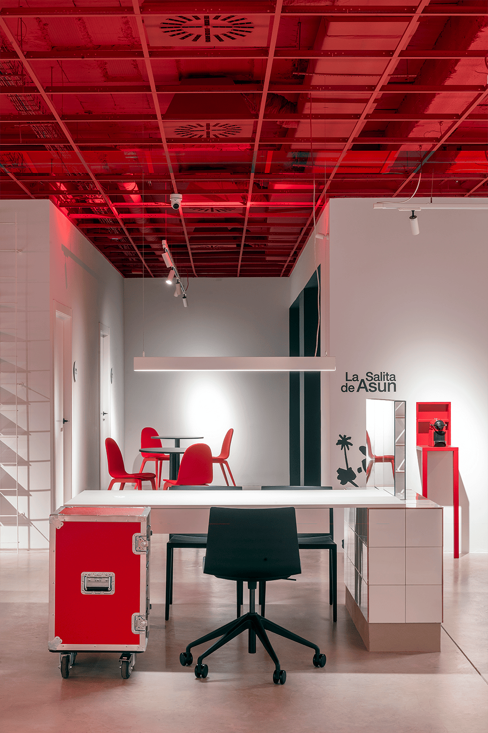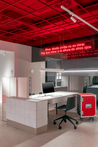 “Mirar desde arriba no es mirar. Hay que mirar a la altura de otros ojos” dice uno de los ángeles de la película de Wim Wenders , El Cielo sobre Berlín. La apuesta era arriesgada y segura al mismo tiempo. El rojo es el color de la tierra y la tradición. El rojo terracota o ladrillo es omnipresente en los paisajes españoles, reflejándose en tejados, suelos y cerámicas. Llevado a su máxima expresión se llega a este rojo bermellón (RAL 3001) que se aplica en los techos de las zonas públicas del local, intensificándose al proyectar también luz roja sobre algunas áreas, enfatizando así las diferentes texturas creadas por las instalaciones vistas e irregulares, aunque meticulosamente ordenadas bajo el forjado que limita con la primera planta del edificio. Este efecto conseguido en los techos dota al espacio de cierta irrealidad, aportando sentido lúdico enfocado a liberar tensiones y fomentar la imaginación.