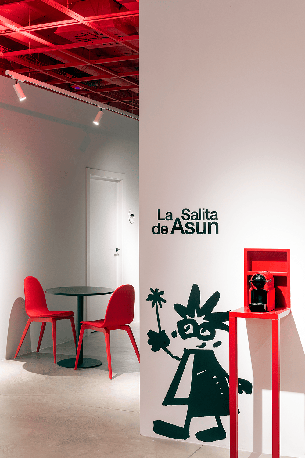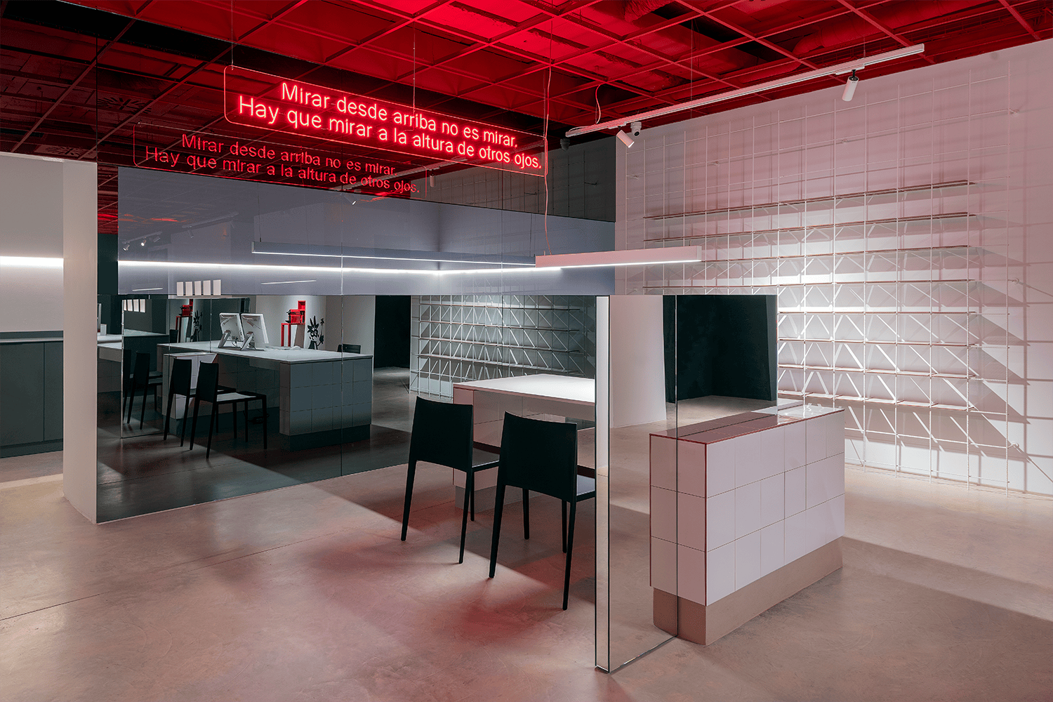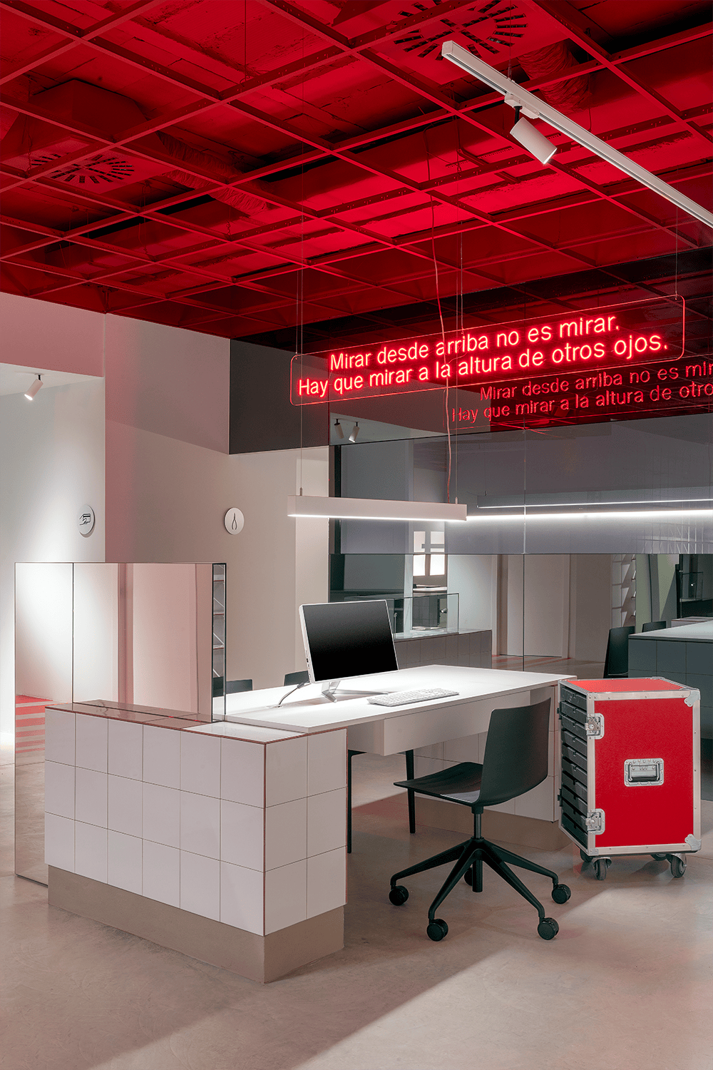 Se juega a dividir, tierra y cielo, a invertir, cielo y tierra. El rojo es audaz, es lo sublime, la tierra en el cielo, arriba es donde ocurren cosas que a veces no vemos. Por otra parte, lo sereno, blanco, limpio y ordenado, se encuentra bajo la retícula que antes servía para soportar las placas del falso techo. Se retira lo falso para ver lo auténtico. Paisaje rojo que queda arriba, sobre nosotros, de donde desciende un mensaje que habla de mirar a la altura de otros ojos. Es una metáfora de empatía y conexión humana, que es lo primero que tiene que manifestar cualquier espacio destinado a la salud, como es el caso de este establecimiento.