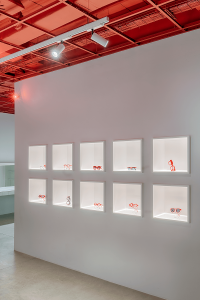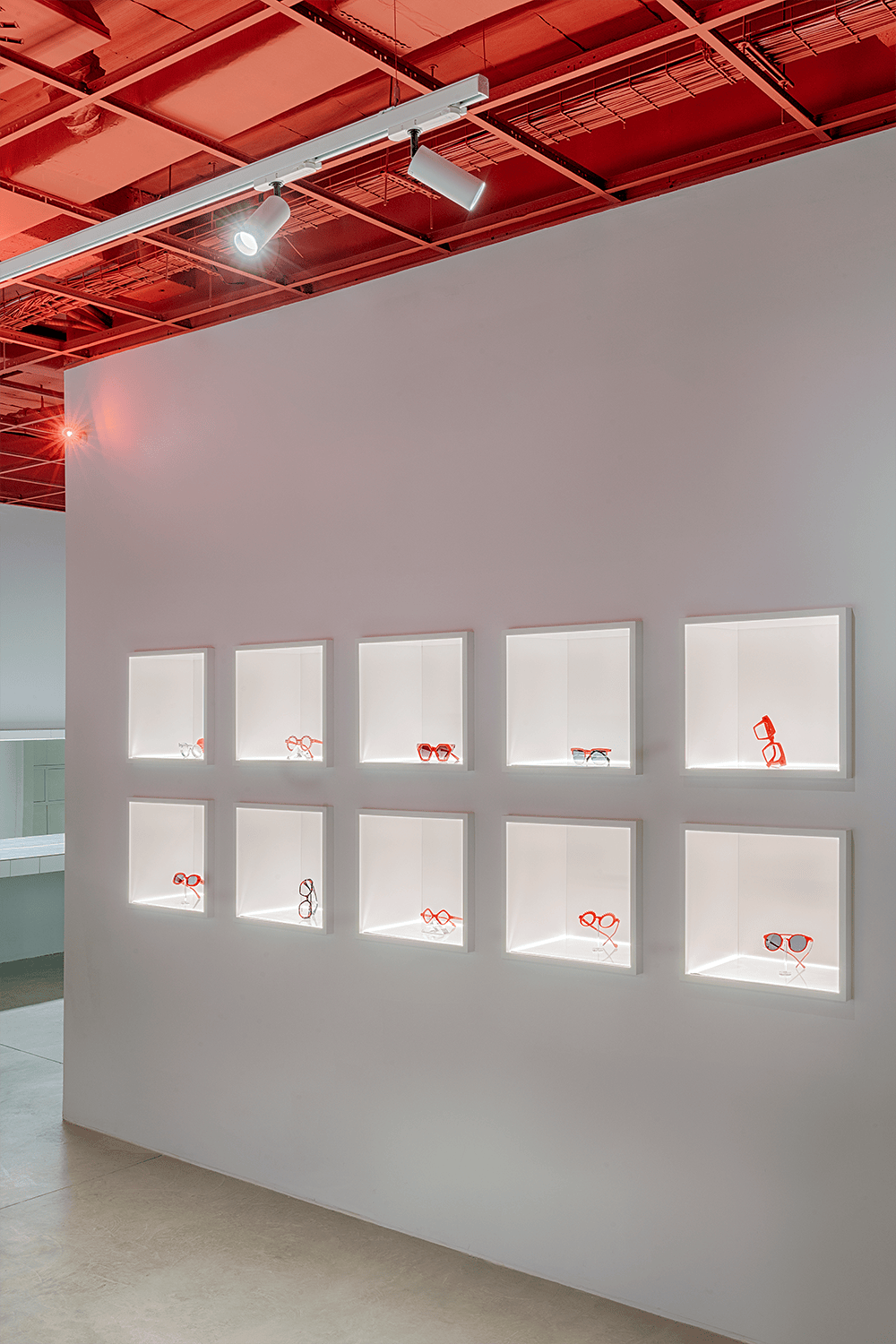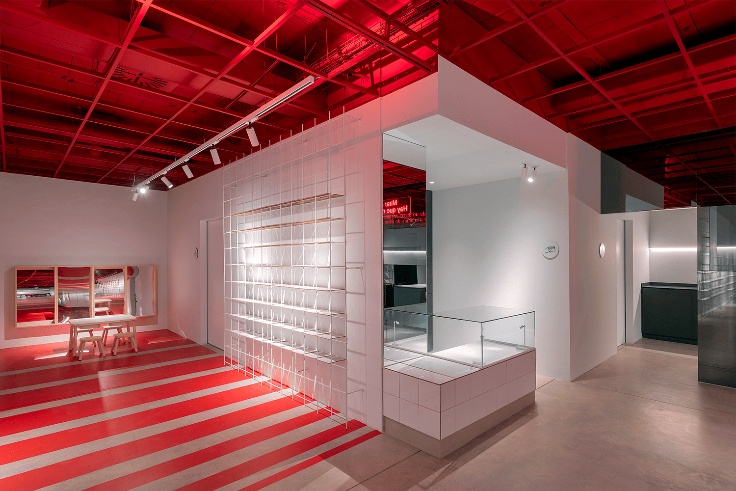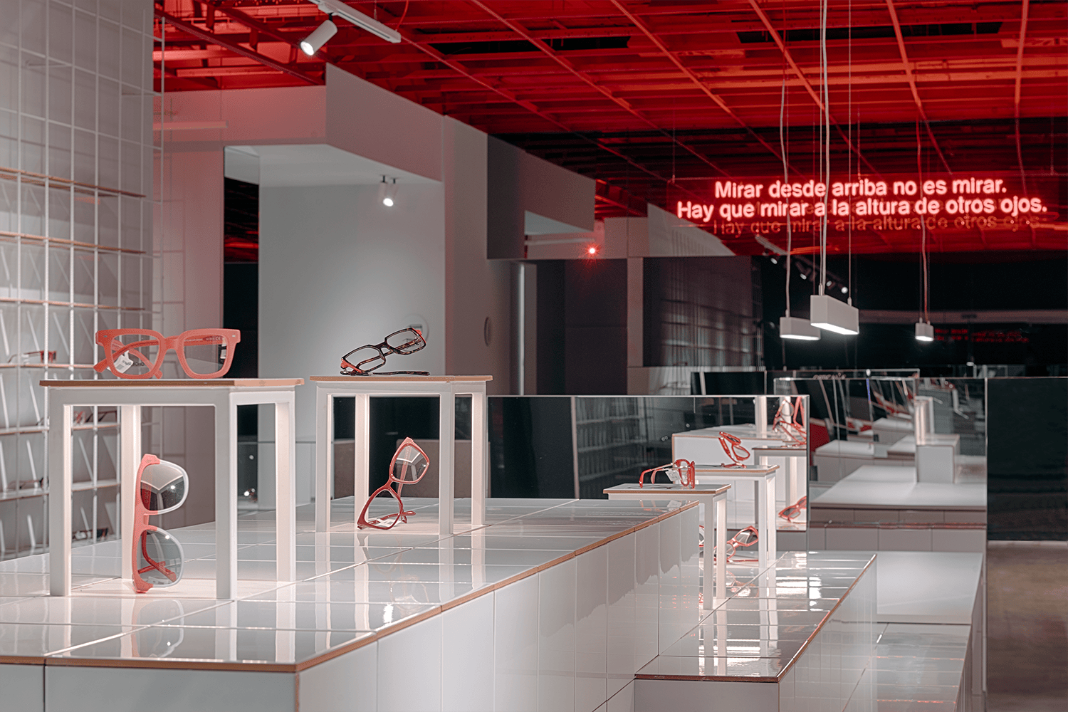 Las estanterías que recorren las paredes, realizadas con malla electrosoldada a base varilla corrugada de 10mm, utilizan como anaqueles los mismos tradicionales azulejos de 20 x 20 cm creando así cubículos que permiten aislar enmarcando y distinguiendo cada gafa de las demás. La proyección de las luces sobre estas estructuras genera un ritmo de sombras, limpio, tajante y ordenado.