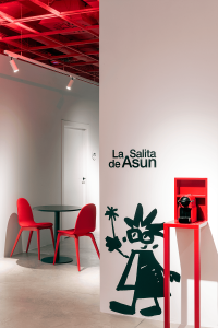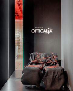 Ubicada en una sala perpendicular al espacio principal en su parte derecha y como preámbulo de los gabinetes donde se realizan las pruebas ópticas, encontramos “La Salita de Asun” un espacio polivalente equipado con mesas de café, que sirve como sala de espera para los diferentes servicios que se ofrecen y evitar así aglomeraciones en el área de tienda, pero también para charlar distendidamente con el óptico que te va a atender. Es un espacio pensado también para pequeñas exposiciones temporales de artistas o presentación de nuevas colecciones de gafas o nuevos productos ópticos. En esta zona se ubican también dos pequeños aparatos para pruebas prediagnósticas de visión.