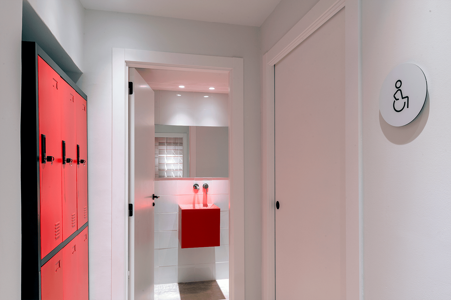 El equipo de diseño tuvo claro desde el principio que el rojo tenía que tener protagonismo. Llegando finalmente a la conclusión de que sería el color que impregnaría todo el techo creando un paisaje singular, fabuloso. Un color intensamente activo que nos ayuda a conectar con nuestra naturaleza terrenal, en este espacio donde lo sanitario y lo estético se funden en una sola cosa.
