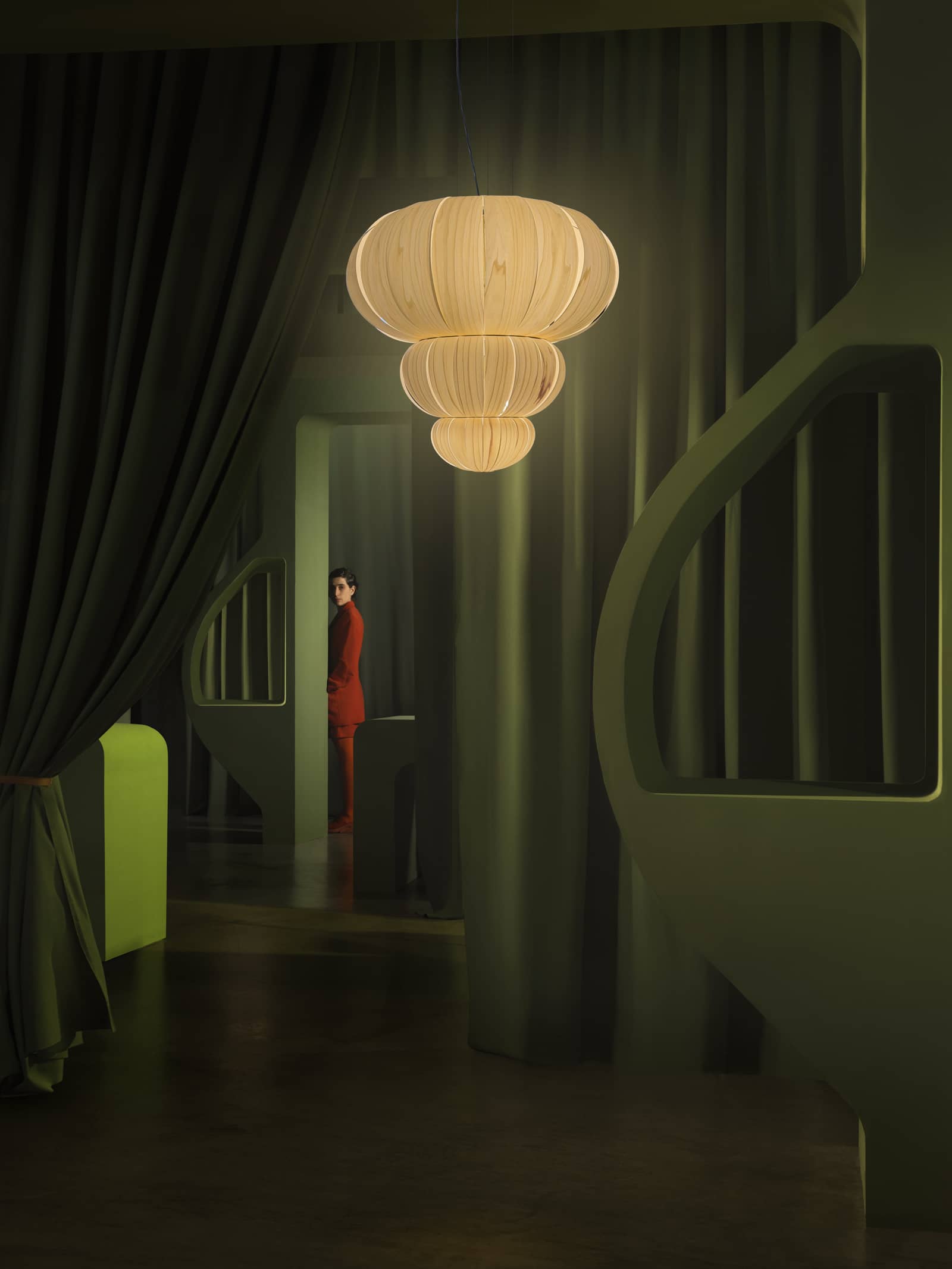 En el ámbito lumínico, LZF Lamps pre­sen­ta la evolución de Ara­bes­co, una lumi­na­ria que debu­tó en la edición ante­rior como exploración con­cep­tual y que regre­sa aho­ra con un rediseño que la acer­ca a su fase final de desa­rro­llo. Ins­pi­ra­da en la heren­cia cul­tu­ral española y rea­li­za­da en cha­pa de made­ra median­te la tecnología Tim­ber­li­te®, Ara­bes­co encar­na la transición de instalación artística a obje­to pre­pa­ra­do para inte­grar­se en pro­yec­tos contemporáneos.